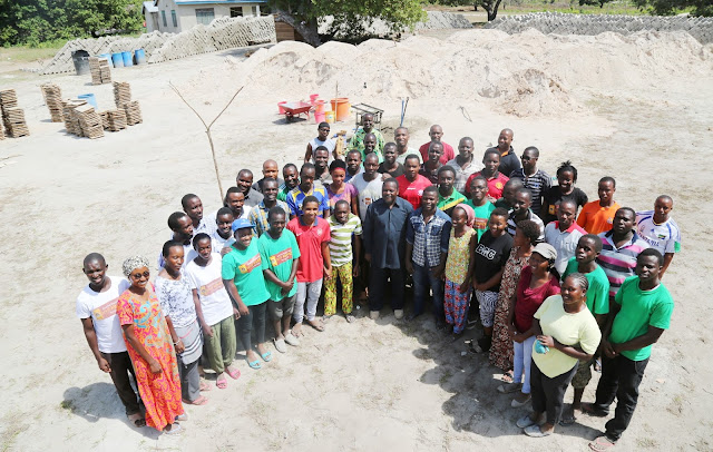 Mkuu wa Wilaya ya Mkuranga Mhe. Filbert Sanga akipungia pamoja na vijana hao wasomi 53 baada ya kukamilisha kufyatua matofali 45,000 kwa ajili ya mabweni matano na nyumba tano za walimu Shule ya Sekondari ya Nasibugani wilayani Mkuranga mkoa wa Pwani.