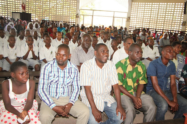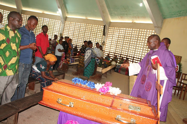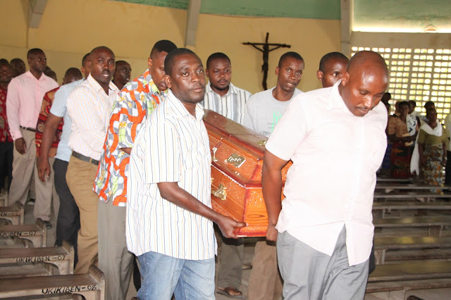 Baba wa marehemu, ASP Masala (wa pili kulia aliyevaa shati la kitenge), akiwa na ndugu zake na waumini waombolezaji katika ibada ya kuuaga mwili wa mtoto wake kabla ya kuondoka kwenda nyumbani kwao mkoani Rukwa kwa mazishi.