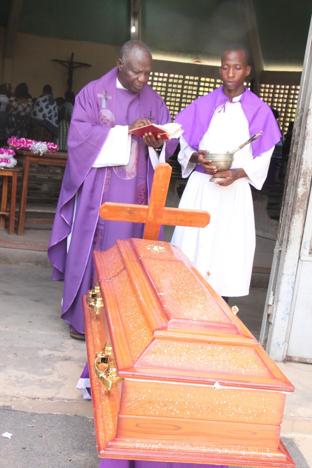 Padre aliyekuwa akiendesha ibada hiyo akilinyunyuzia mafuta ya baraka jeneza lenye mwili wa mtoto Maria.