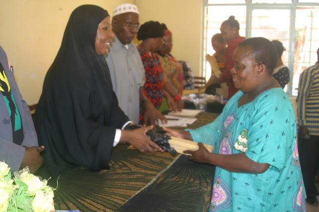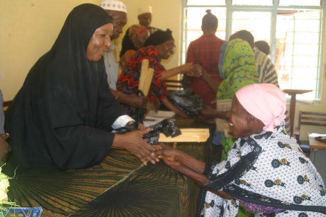 Mkuu wa wilaya ya Muheza, Mhandisi Mwanasha Tumbo kushoto akigawa zawadi ya sabuni kwa mmoja kati ya wazee wilayani humo wakati wa siku ya wazee dunia kiwilaya iliyofanyika kwenye ukumbi wa Halmashauri wilayani humo habari kwa hisani ya blog ya kijamii ya Tanga Raha