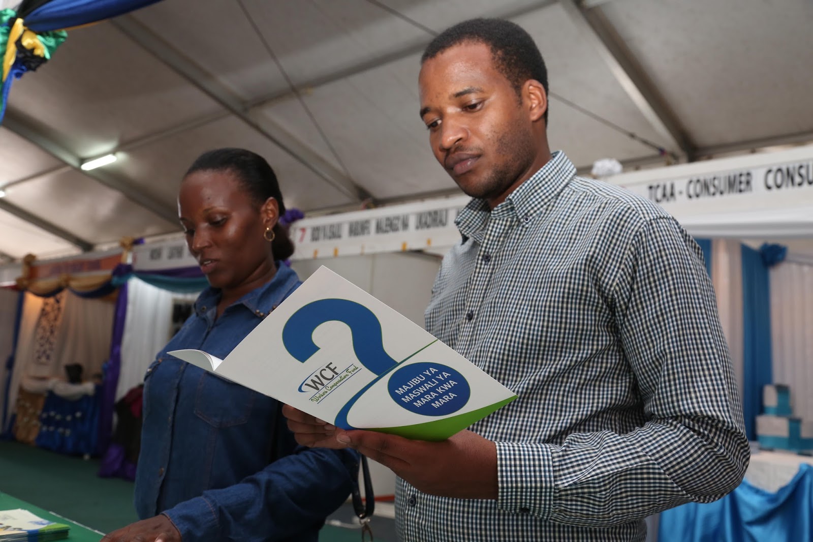 Bi.Bi.Inocencia William, (kushoto), afisa wa WCF akiwahudumia wananchi hawa waliofika kwenye banda la Mfuko huo.