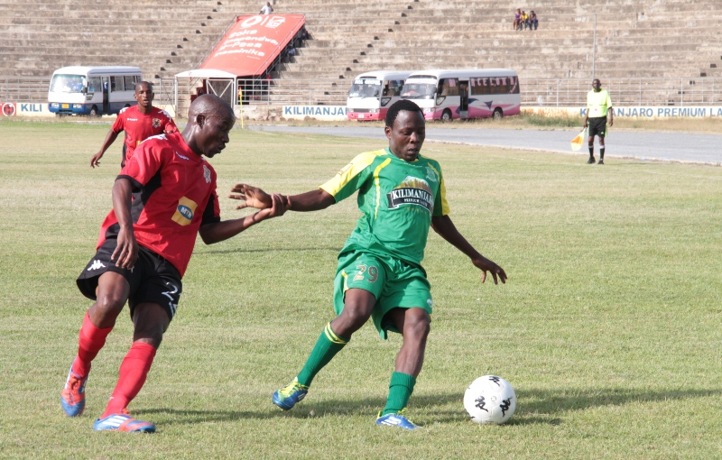 Golikipa wa Black Leopards Posnett Omony akijitahidi kuokoa mpira uliopigwa kwa kichwa na mchezaji wa Yanga, Said Bahanuzi na hatimaye kutinga kimiani mnamo dakika ya saba ya mchezo katika Uwanja wa CCM – Kirumba Jijini Mwanza.