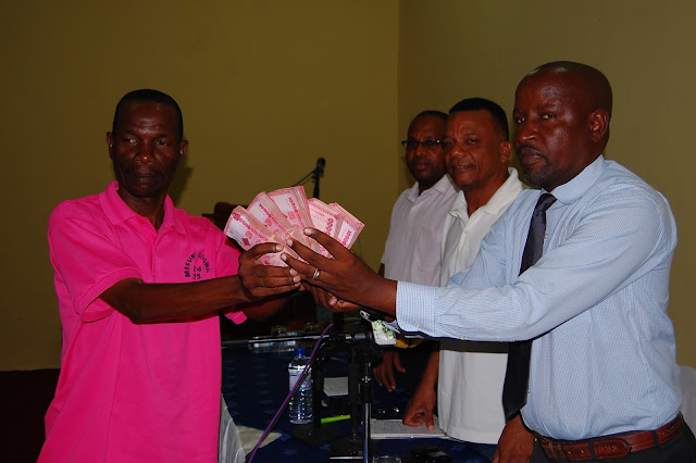 Meneja wa Makampuni ya Hoteli ya Zanzibar Ocean View Zanzibar Jacob Makundi akimkabidhi Milioni tano fedha za mauzo ya Tiketi ya Mchezo wa Mafunzo na AS Vita Club ya Congo Kiongozi wa Timu hiyo Khamis Ali Machenga, mchezo utakaofanyika katika Uwanja wa Amaan Zanzibar, Kampuni ya Zanzibar Ocean View Imenunua tiketi hizo zote za mchezo huo na kutowa fursa kwa Wananchi na Wapenzi wa Michezo Zanzibar kujionea Michuano hiyo ya CAF kujionea bure. makabidhiano hayo yamefanyika katika Ukumbi wa hoteli hiyo Kilimani Zanzibar