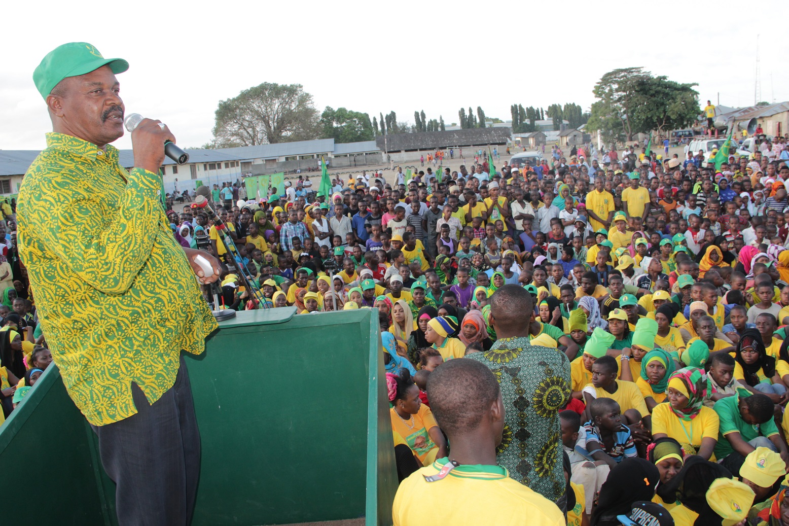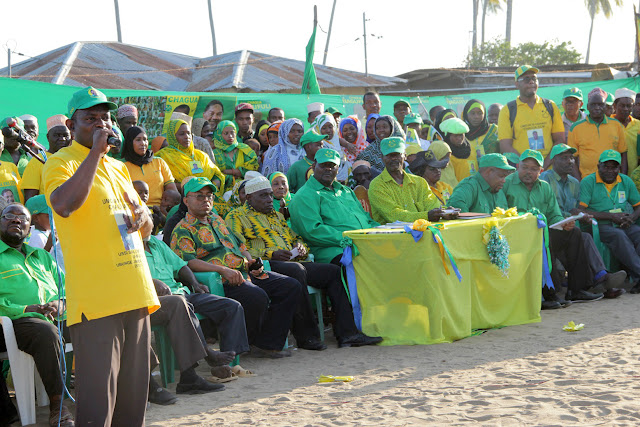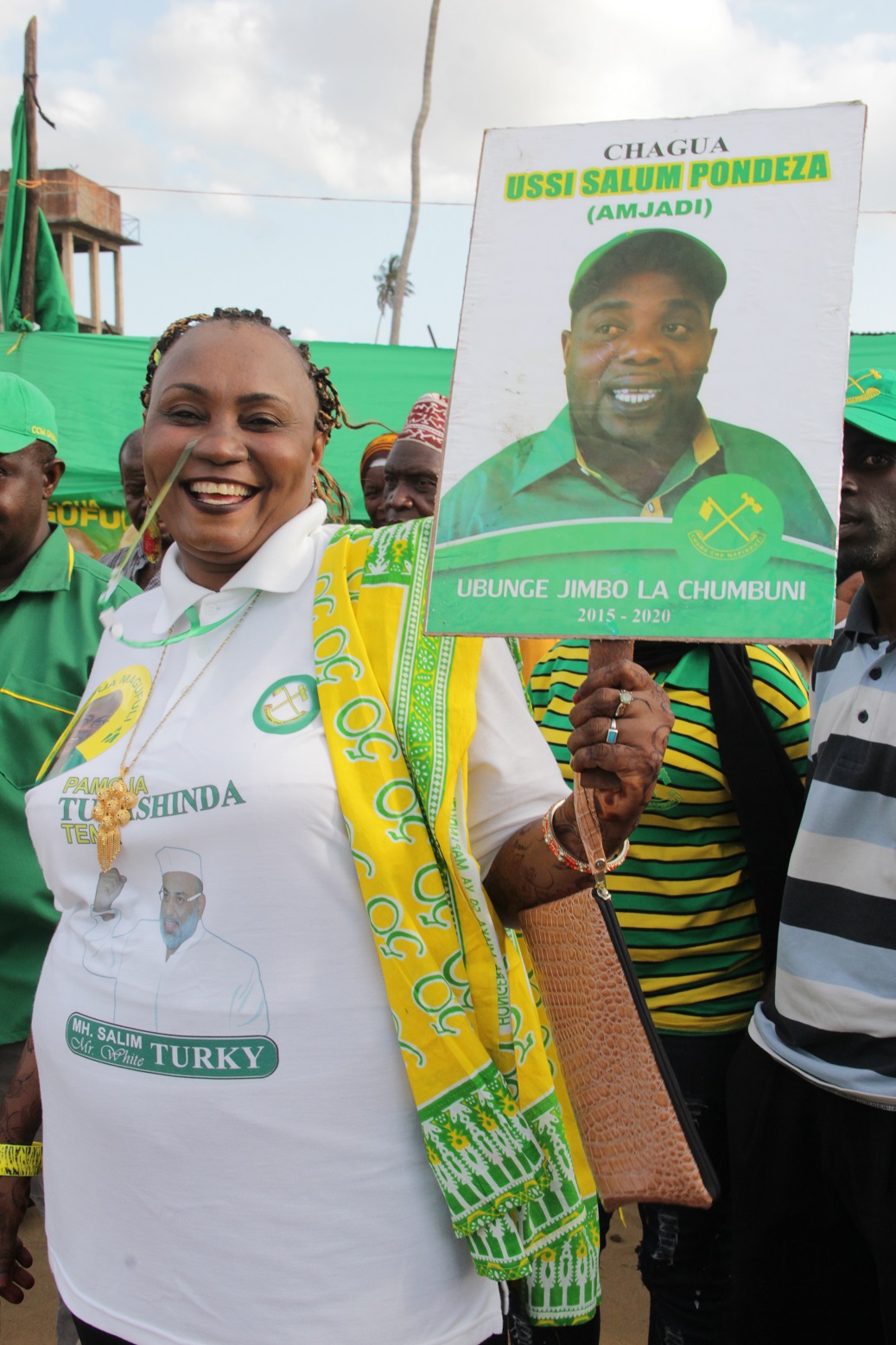 Wanachama wa CCM wakishangilia wakati wa mkutano wa kampeni wa Jimbo la Chumbuni Unguja wakati akihutubia Mgombea Ubunge wa Jimbo hilo Ussi Salum Pondeza AMJADI, uliofanyika viwanja vya mabanda ya ngombe chumbuni Unguja.