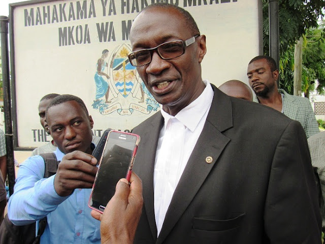Mutabanzi Julius Lugaziya ambae ni Mwanasheria Mwandamizi aliekuwa akimtetea  Angelina Mabula akihojiwa na Wanahabari nje ya Mahakama