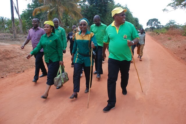 Katibu wa NEC, Siasa na Uhusiano wa Kimataifa Dj. Asha-Rose Migiro naKatibu wa NEC, Itikadi na Uenezi Nape Nnauye wakiungana na wananchi kutembea kwa mguu katika barabara ya Mtwara Masasi, ambayo utengenezwaji wake unaendelea. Viongozi hao wapo na Katibu Mkuu wa CCM Abdulrahman Kinana, ambaye kesho, Novemba 15, 2013, anaaza ziara ya siku 22 katika mikoa ya Ruvuma na Mbeya.