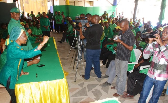 Katibu wa NEC, Siasa na Uhusiano wa Kimataifa CCM, Dk. Asha Rose Migiro akisalimia wajumbe wa Halmashauri Kuu ya CCM wilaya ya Masasi baada ya kutambulishwa na Kinana kwenye kikao chake na wajumbe hao, Nov 13, 2013. Imetayarishwa na theNkoromo Blog
