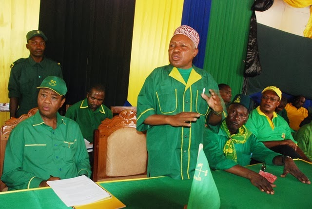 Mwenyekiti wa CCM wilaya ya Masas mkoani Mtwara, Kazumari Malilo, akifungua kikao cha Halmashauri Kuu ya CCM, kwenye ukumbi wa Ofisi ya CCM wilayani humo leo. Nov 13, 2013. Kushoto ni Katibu Mkuu wa CCM Abdulrahman Kinana ambaye aloizungumza na wajumbe wa kikao hicho.