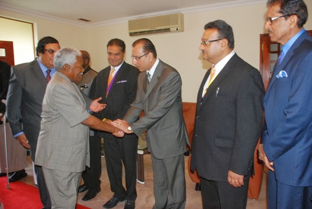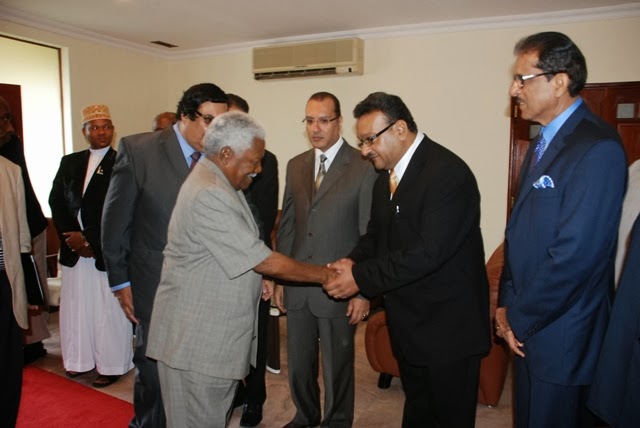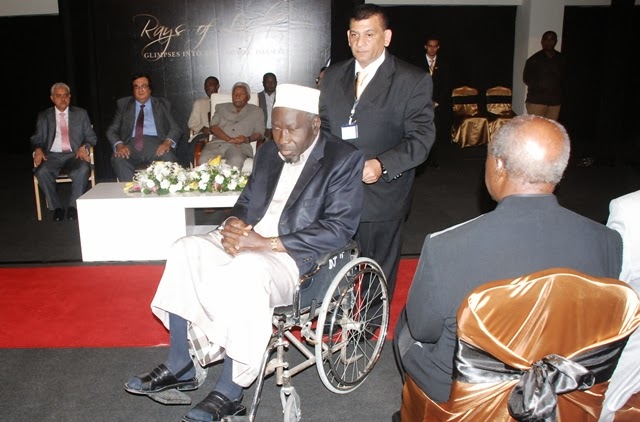 Rais Mstaafu wa awamu ya Pili, Alhaj Ali Hassan Mwinyi akikaribishwa katika hafla ya Maonyesho ya picha kuhusu Taasisi ya Aga Khan, jana kwenye ukumbi wa Diamod Jubilee jijini Dar es Salaam.