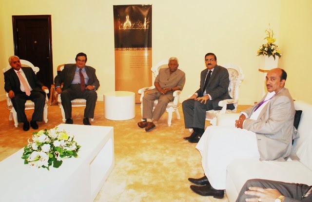 Mzee Mwinyi akiwa ameketi meza kuu na viongozi wa Tasisi hiyo ya Aga Khan.