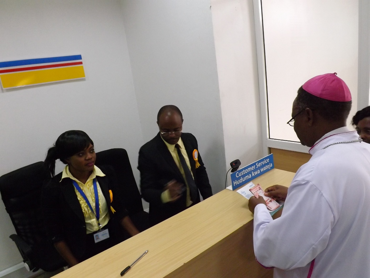 Baba Askofu Isaac Aman akiweka pesa katika akaunti mara baada ya kufungua tawi la Benki hiyo mjini Moshi.