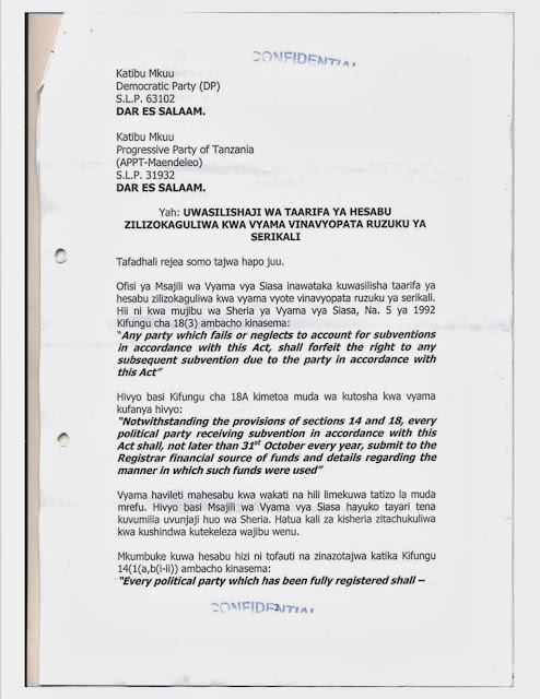 ukaguzi wa mahesabu ya vyama vya siasa, iliyokuwa inajibu barua