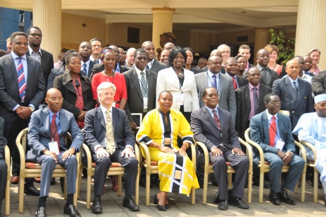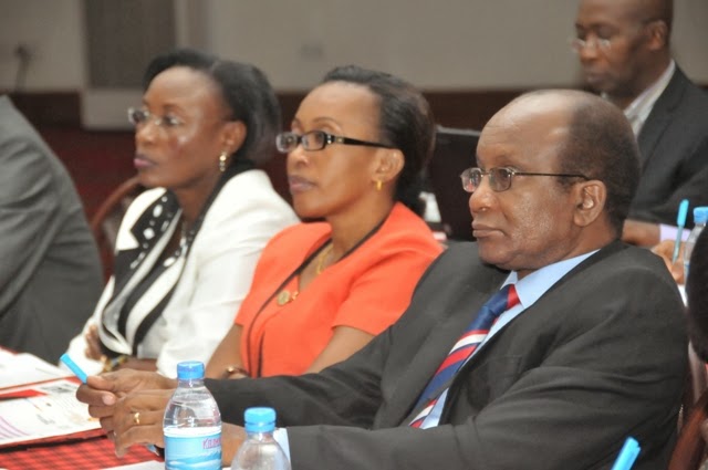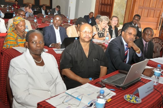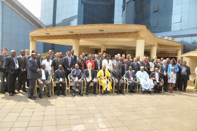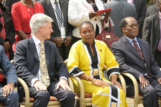 la uhamaji wa mfumo wa utangazaji kutoka analojia kwenda dijitali Afrika 2014 (DBSF)ulioanza leo jijini Arusha. Katikati ni Katibu