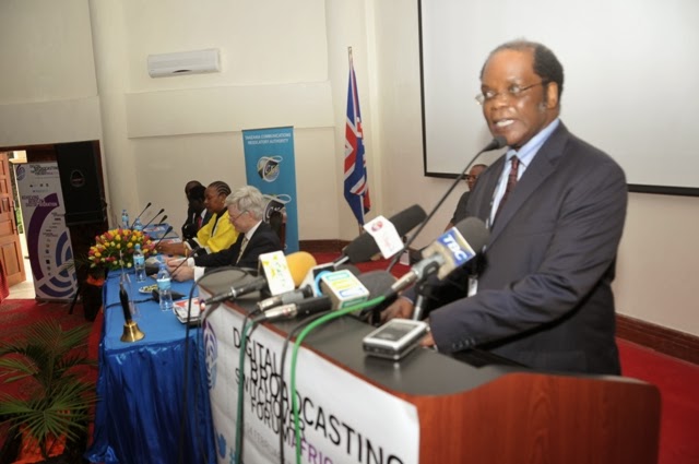 Waziri wa Habari, vijana, Utamaduni na Michezo, Dk. Fenela Mukangara akifuatilia hotuba mbalimbali katika ufunguzi wa Kongamano la 9 la uhamaji wa mfumo wa utangazaji kutoka analojia kwenda dijitali Afrika 2014 (DBSF) ulioanza leo jijini Arusha. Katikati ni Katibu Mtendaji wa Shirika la Mawasiliano kwa nchi za Jumuia ya Madola (CTO), Tim Unwin akifuatiwa na Mkurugenzi Mkuu wa Mamlaka ya Mawasiliano Tanzania (TCRA), Prof. John Nkomwa.