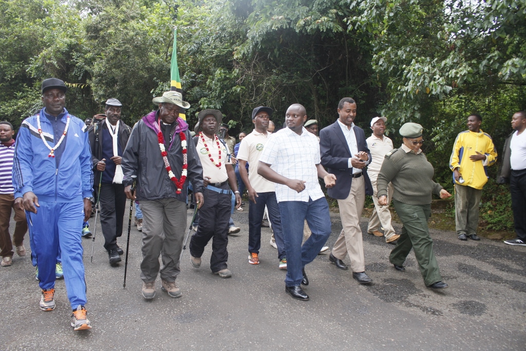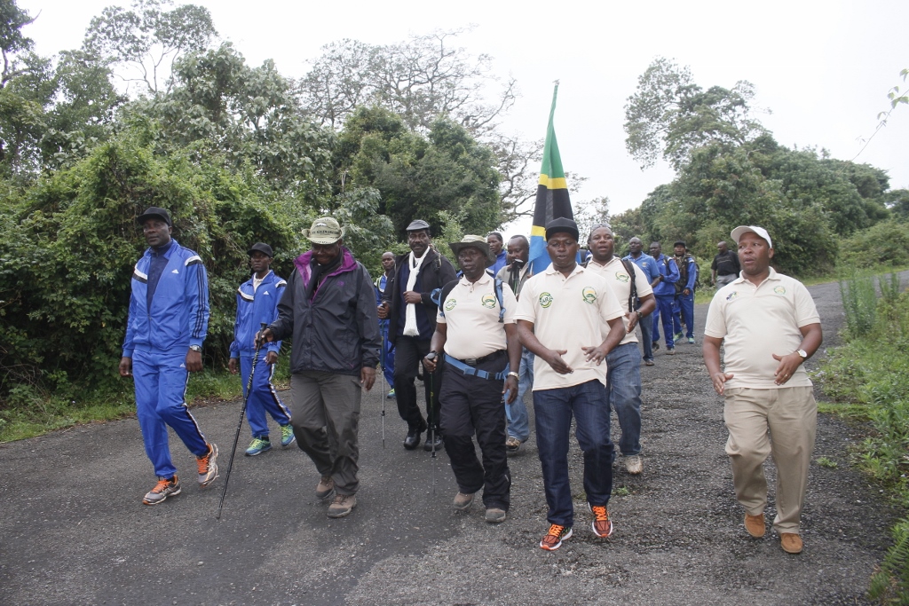 Washiriki wa changamoto ya kupanda Mlima Kilimanjaro kwa ajili ya kusherehekea kumbukumbu ya Miaka 55 ya Uhuru wa Tanzania Bara wakiwemo Askari Jeshi la Wananchi Tanzania (JWTZ) na Waandishi wa Habari wakishuka baada  ya kupanda mlima huo kwa siku sita. Zoezi hilo limeongozwa na Mkuu wa Majeshi ya Ulinzi Mstaafu Jenerali George Witara (Mwenye fimbo mstari wa mbele) na Naibu Kamanda wa Kikosi cha Ardhini (JWTZ) Brigedia Jenerali Jairo Mwaseba (kushoto).
