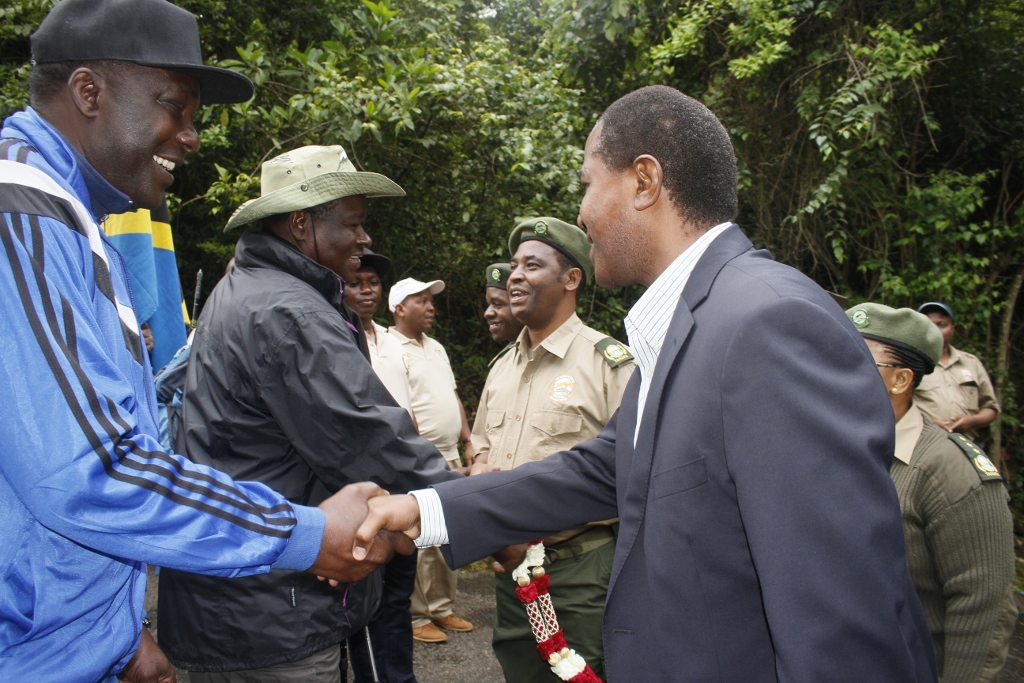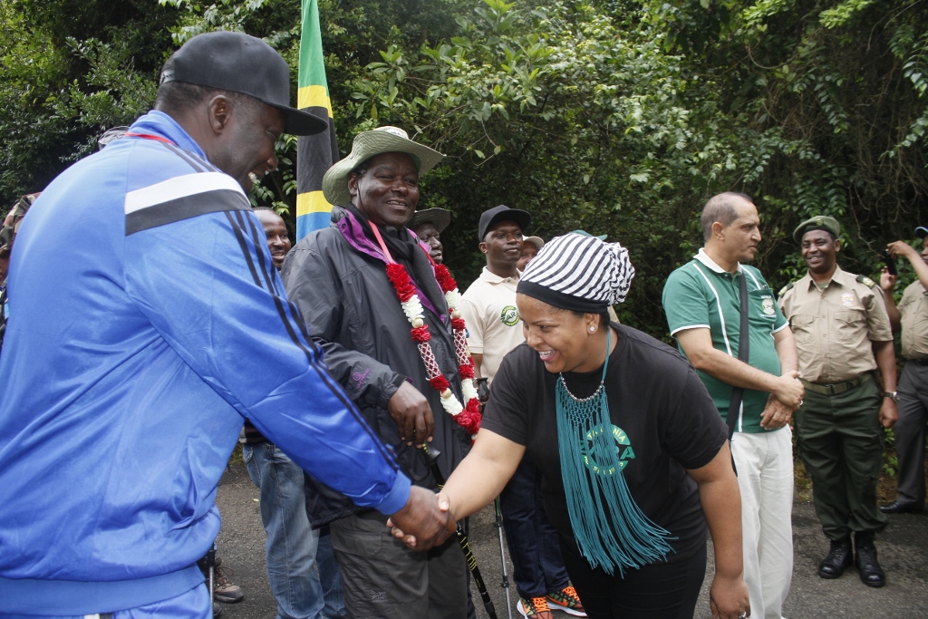 Mkuu wa Wilaya ya Moshi, Kippi Warioba akipokea Washiriki wa changamoto ya kupanda Mlima Kilimanjaro walipofika katika lango la Marangu,Kippi akisalimiana na Brigedia Jenerali Jairo Mwaseba.