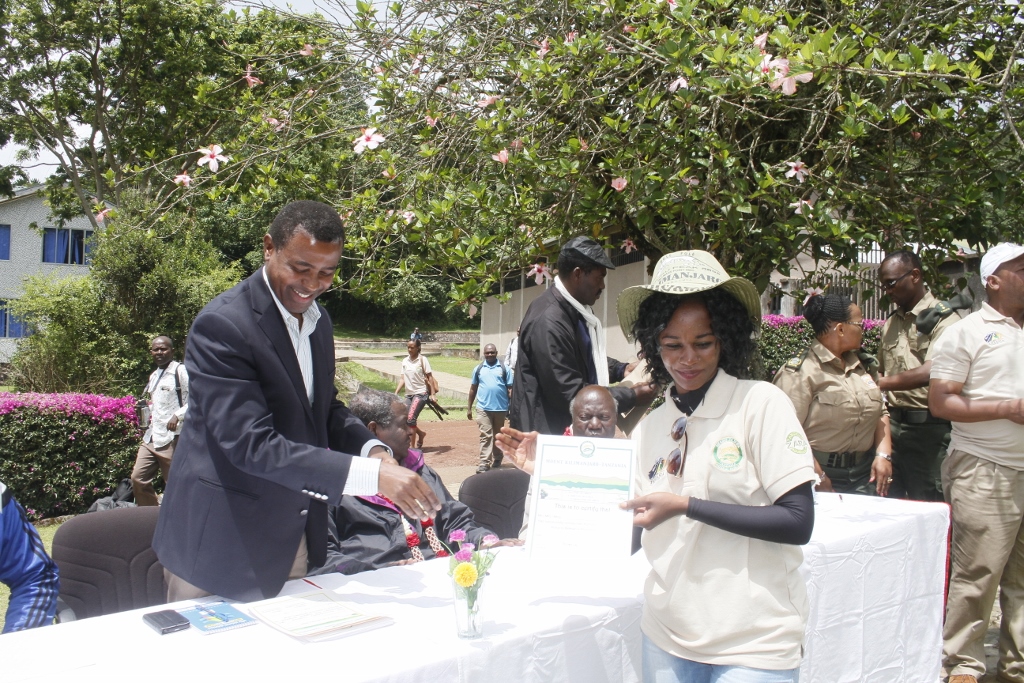 Mkuu wa Wilaya ya Moshi Kippi Warioba akimkabidhi Cheti Mwandishi wa Habari wa Gazeti la Mwananchi, Arusha, Zulfa Musa baada ya kufanikiwa kufika kilele cha Uhuru ,umbali wa mita 5895 kutoka usawa wa bahari akiwa ni miongoni mwa wasicha wawili waliofika kileleni.