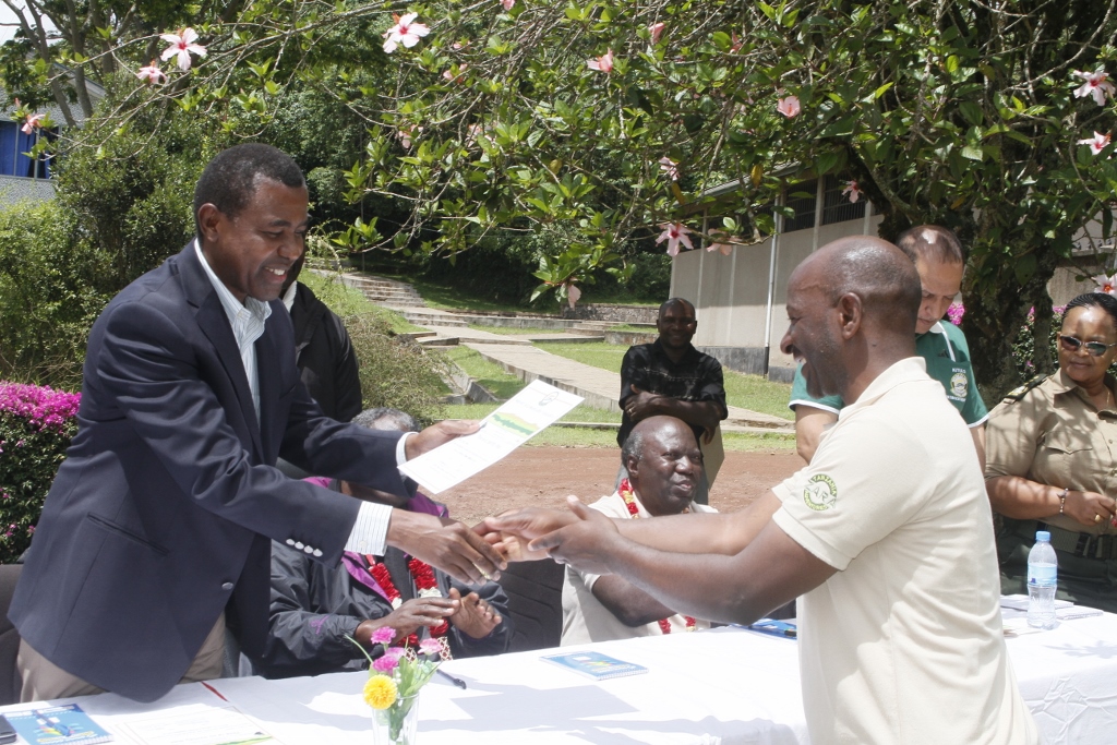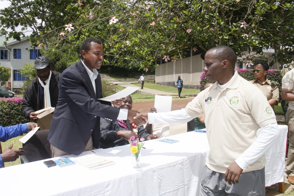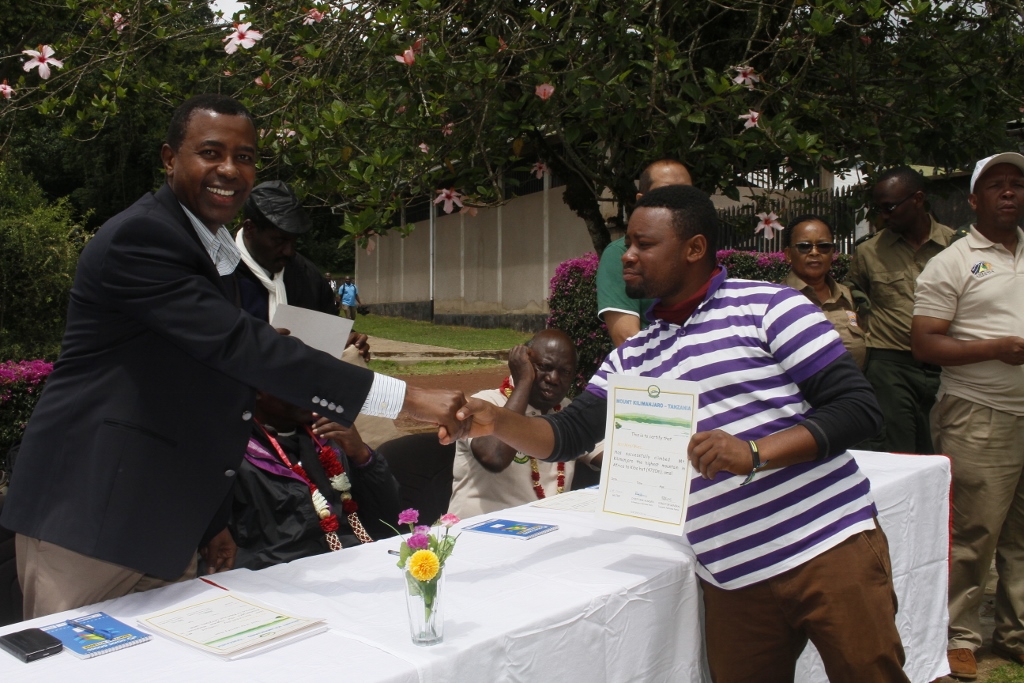 Mkuu wa Wilaya ya Moshi,Kippi Warioba akimkabidhi Cheti ,Mhifadhi Utalii katika Hifadhi ya Taifa ya Mlia Kilimanjaro,Charles Ngendo mara baada ya kufanikiwa kufika katika kilele cha Uhuru.
