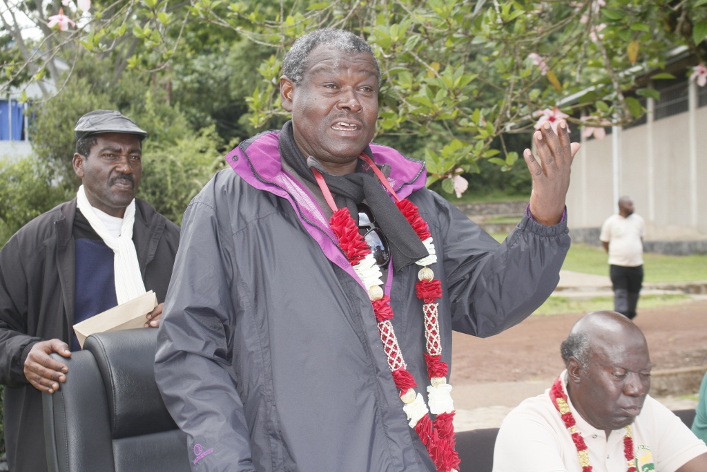 Mkuu wa Majeshi ya Ulinzi Mstaafu Jenerali George Waitara ,kiongozi wa msafara wa wapandaji wa Mlima Kilimanjaro kwa ajili ya kumbukumbu ya miaka 55 ya Uhuru akivishwa shada la maua mara baada ya kufika katika lango la Marangu.