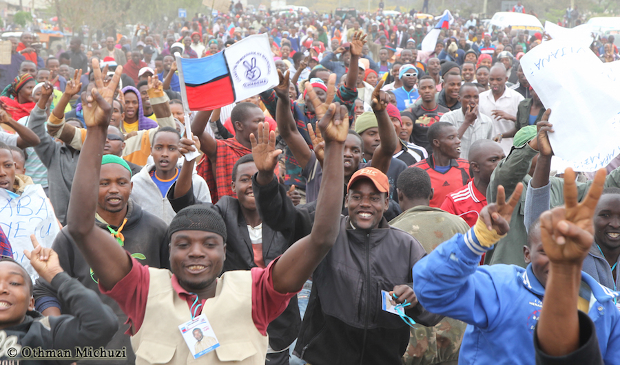Sehemu ya wananchi wa eneo la Kisongo, Jijini Arusha wakiwa wamefunga barabara kuzuia msafara wa Mgombea Urais wa Chama cha Demokrasia na Maendeleo (CHADEMA) kupitia mwamvuli wa UKAWA, Mh. Edward Lowassa, ili waweze kumsalimia na kumsikiliza, wakati alipokuwa njiani kuelekea eneo la Ngaramtoni mpaka Namanga, kwenye Mkutano wa Kampeni, leo Oktoba 7, 2015.PICHA ZOTE NA OTHMAN MICHUZI, ARUSHA.