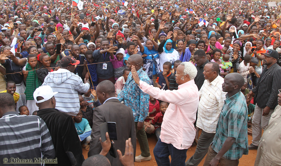Mgombea Urais wa Chama cha Demokrasia na Maendeleo (CHADEMA) kupitia mwamvuli wa UKAWA, Edward Lowassa, akiwapungia wananchi wa Jimbo la Longido waliohudhulia Mkutano wa Kampeni zake, uliofanyika kwenye Uwanja wa Namanga, Jijini Arusha Oktoba 7, 2015.