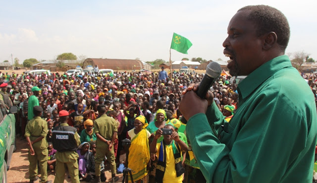 Mjumbe wa Kamati ya Kampeni ya CCM Taifa akinadi Sera za CCM mkutano wa hadhara Meatu leo.