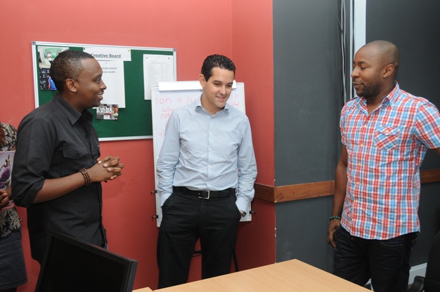 Mkuu wa Vipindi wa Clouds FM, Sebastian Maganga akifafanua jambo kwa Meneja Mkuu wa kampuni ya simu ya mikononi ya Tigo, Diego Gutierrez (pichani kati),Kulia ni mmoja wa watangazaji wa Clouds FM, Ruben Ndege.