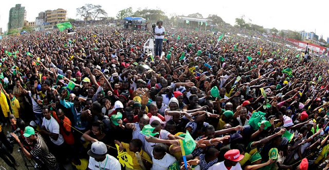 Umati wa Wakazi wa jiji la Arusha na Vitongoji vyake wakifuatilia hotuba zilizokuwa zikitolewa na Viongozi wa Chama cha Mapinduzi CCM wakati wa Kampeni za Kumnadi Mgombea Urais wa Chama hicho Dkt John Pombe Magufuli jijini humo.