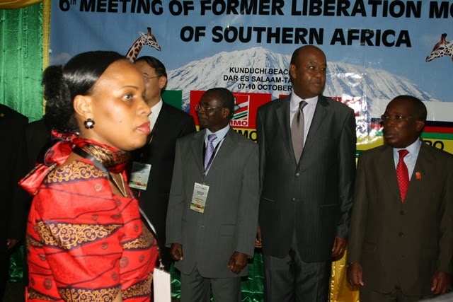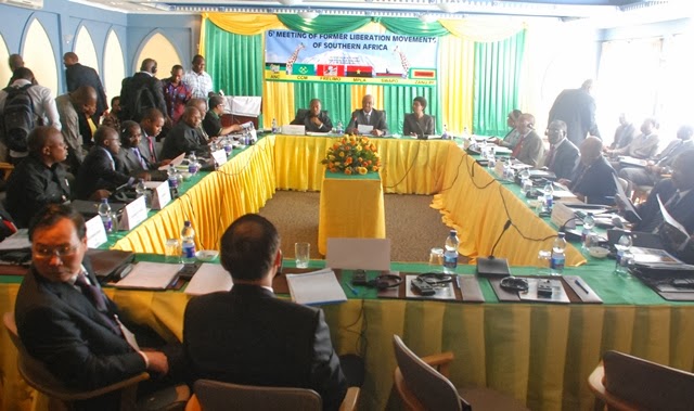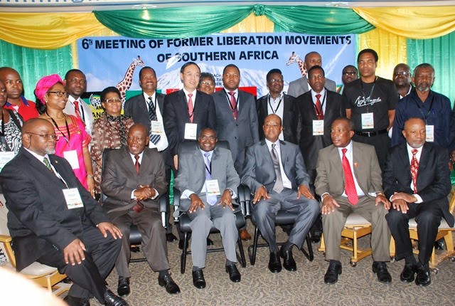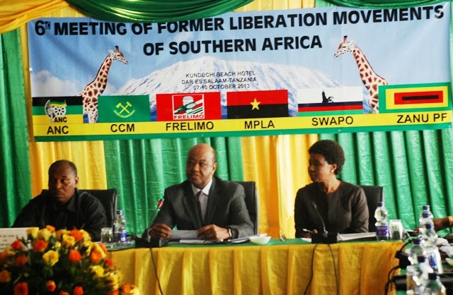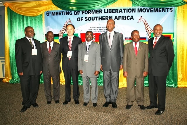VIONGOZI wa vyama vilivyokuwa vya Ukombozi Kusini mwa Afrika, walioshiriki kwenye mkutano wa sita wa vyama hivyo, leo kwenye hoteli ua Kunduchi Beach, jijini Dar es Salaam, Kutoka kushoto, Katibu Mkuu wa Chama Cha ANC cha Afrika Kusini, Gwede Mantash, Katibu Mkuu wa chama cha ZANU-PF cha Zimbabwe, Didy Mutasa, Naibu wa Mambo ya Nje na Ushirikiano wa Kimataifa wa Chana Cha Kikomunisti cha China, Ai Ping,Katibu Mkuu wa MPLA cha Angola, Julio Paulo. Katibu Mkuu wa CCM, Abdulrahman Kinana, Katibu Mkuu wa chama cha FRELIMO cha Msubiji, Philipe Paunde na Katibu Mkuu wa Chama cha SWAPO cha Namibia,Nangolo Mbumba