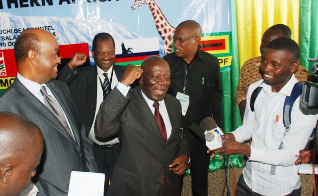 Katibu Mkuu wa Chama Cha ZANU-PF, Didy Mutasa akionyesha alama ya hamasa ya chama chake, alipozungumza na waandishi wa habari, wakati wa mkutano wa makatibu wakuu wa vyama vilivyokuwa vya ukombozi mwa kusini mwa Afrika, kwenye hoteli ya Kunduchi Beach, Dar es Salaam. Kushoto ni Katibu Mkuu wa CCM, Andulrahman Kinana na Wanne kushoto ni Katibu wa NEC, Itikadi na Uenezi, Nape Nnauye.