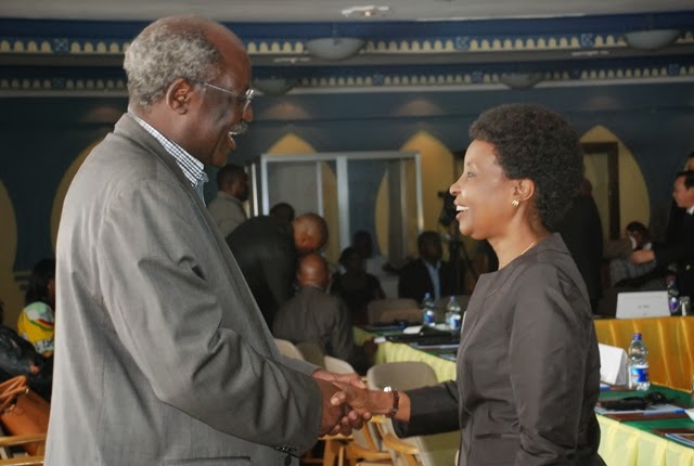 Katibu Mkuu wa sasa wa CCM, Abdulrahman Kinana, akisalimiana na Katibu Mkuu mstaafu Willson Mukama, walipokutana kwenye Mkutano wa sita wa Makatibu Wakuu wa vyama vilivyokuwa vya Ukombozi Kusini mwa Afrika, leo katika hoteli ya Kunduchi Beach, Dar es Salaam. Kushoto ni Katibu wa NEC, Oganaizesheni CCM, Mohamed Seif Khatib.