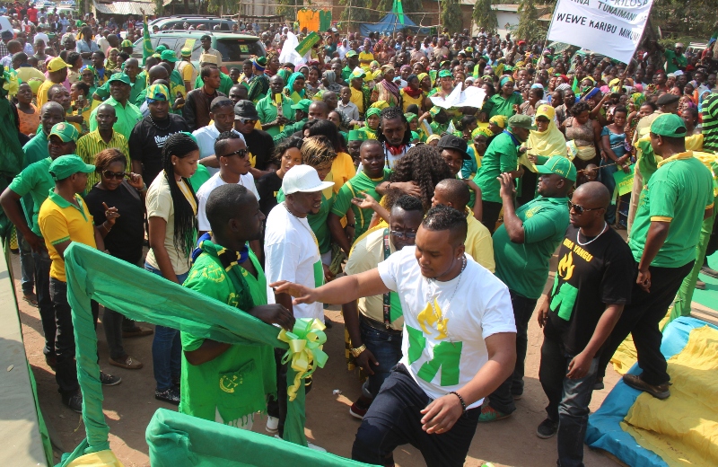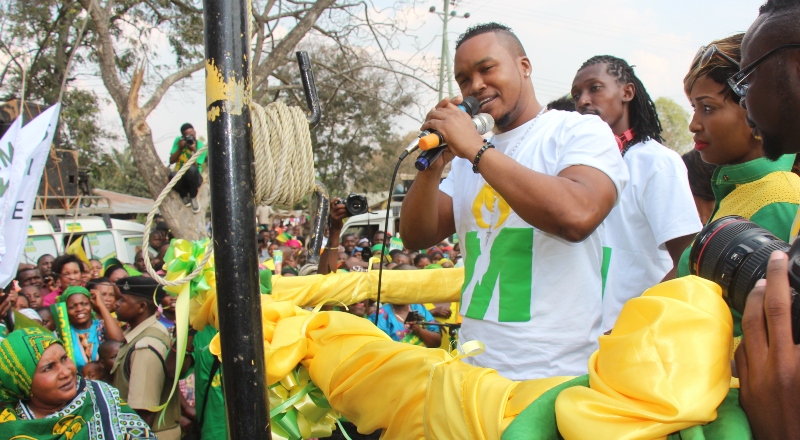 | Msanii Ray na Anti Ezekiel jukwaa kuu wakisalimiana na mgombea mwenza na viongozi wa CCM jukwaa kuu juzi katika Jimbo la Mikumi Morogoro. |