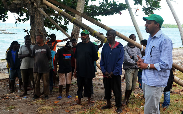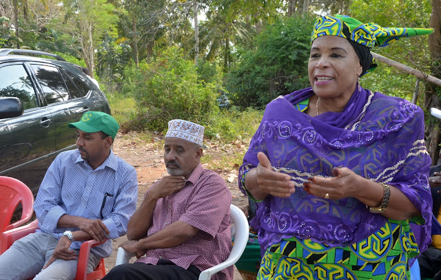 Kiongozi wa Kijiji cha Tindini akitoa maelezo ya ujenzi wa Soko hilo la Samaki katika ufukwe wa bahari yao litakalotowa huduma ya kuuzia samaki kwa wavuvi katika soko la mnada.