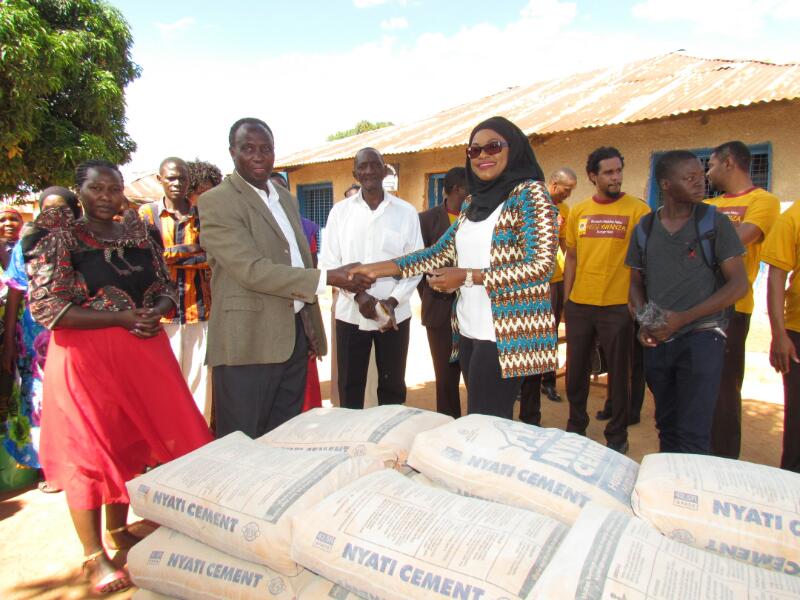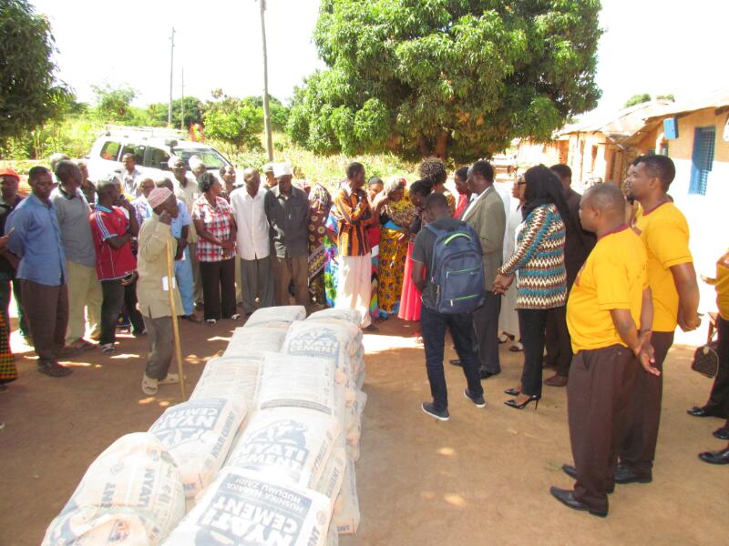 Mifuko ya Saruji ikishushwa tayari kwa ajili ya makabidhiano.