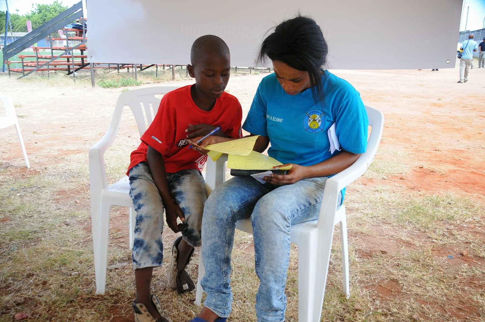 Mtoto Osama Rashid akijaza fomu maalum kwa ajili ya kujiunga na kituo cha michezo cha NSSF-Real Madrid Academy. Kulia ni mama yake Tatu Ali akishuhudia.