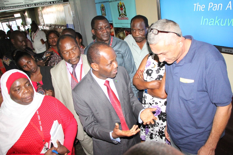 Kamishna Msaidizi wa Uhamiaji, Elizabeth Lukuwi (kushoto), akutoa maelezo kwa Waziri Mbarawa baada ya kufika eneo la ukaguzi kwa wageni.