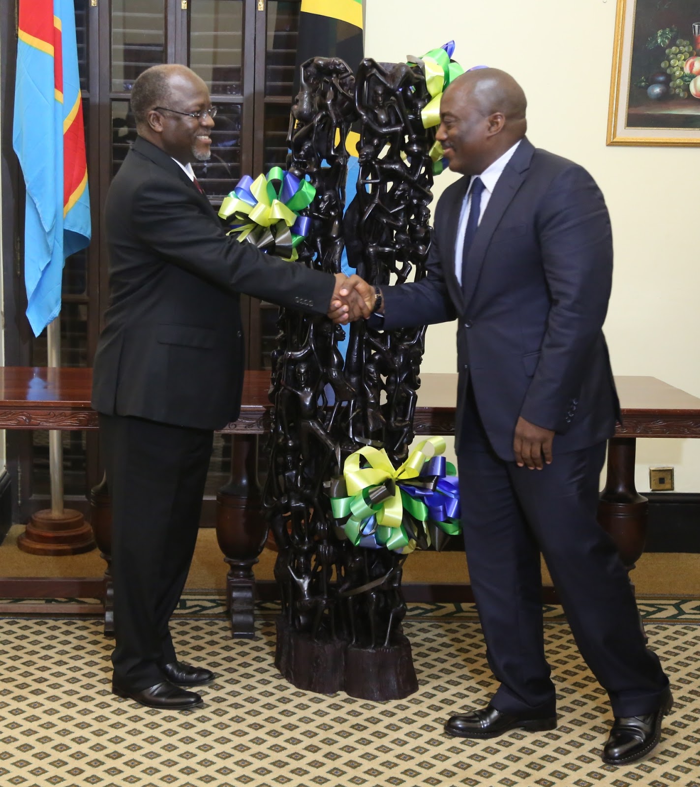 Rais wa Jamhuri ya Muungano wa Tanzania Dkt. John Pombe Magufuli akipokea zawadi ya kinyago toka kwa Rais wa Jamhuri ya Kidemokrasia ya Kongo (DRC), Joseph Kabila Ikulu jijini Dar es salaam leo Septemba 4, 2016.