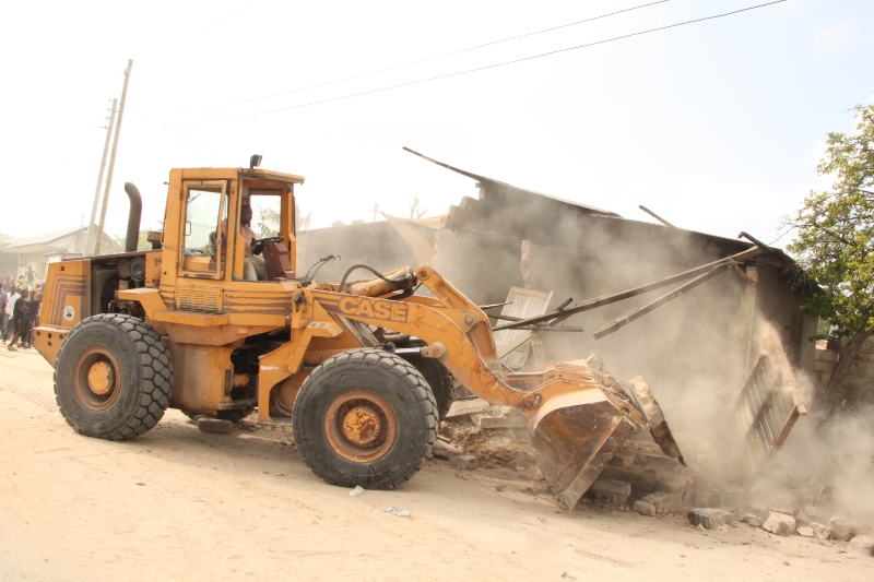 Tingatinga likiisambaratisha moja ya nyumba iliyojengwa kwenye hifadhi ya barabara eneo la Buza kwa Lulenge.