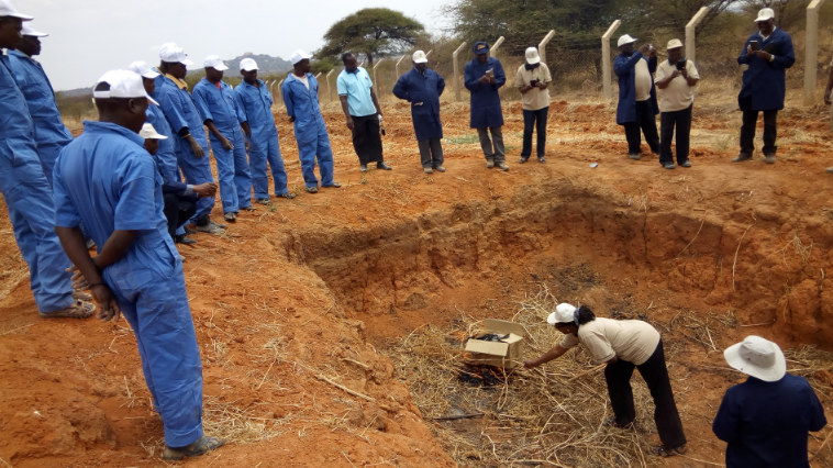 Watafiti wakichoma masalia ya vifungashio vya mbegu za mahindi kama sheria ya GMO inavyoelekeza baada ya zoezi hilo.