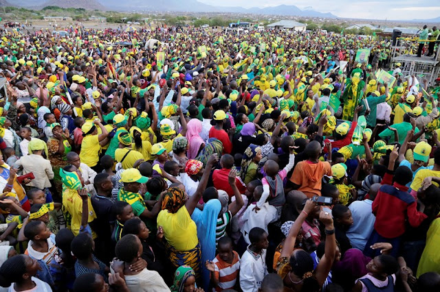wakazi wa Same Magharibi wakishangilia mara baada ya kumsikiliza Mgombea Urais wa CCM Dk. Magufuli kwenye uwanja wa Kwasakwasa ambapo aliwaambia wananchi hao kuwa katika uongozi wake atahakikisha kodi ndogo ndogo zinaondolewa kwa wafanyabiashara wadogo.