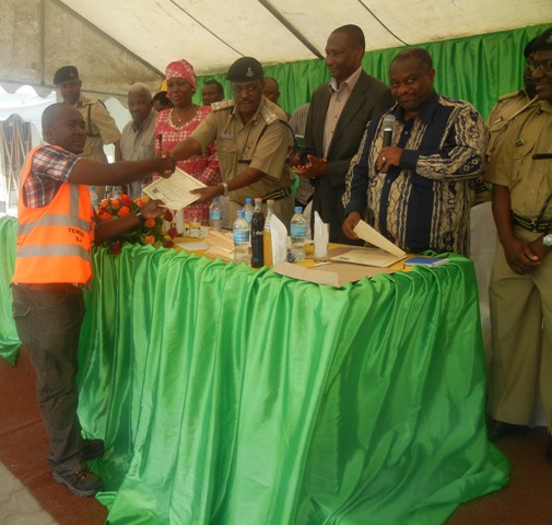 Mgeni rasmi,Kamanda wa Polisi kikosi chausalama barabarani  Tanzania, SACP Mohamed Mpinga akikmkabidhi cheti mmoja wa wahitimu ya mafunzo ya waendesha piki piki yaliyofanyika chuo cha ufundi stadi-VETA Chang’ombe jijini jana. Vijana wapatao 301 kutoka Temeke walipewa vyeti