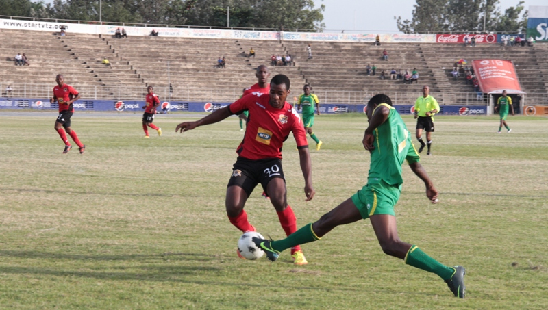Mchezaji wa wa timu ya Yanga David Luhende akitaka kumchomoka mchezaji wa timu ya Black Leopards, Moses Kwena, kwenye mchezo wao wa marudio uliofanyika kwenye uwanja wa CCM Kirumba jijini Mwanza.